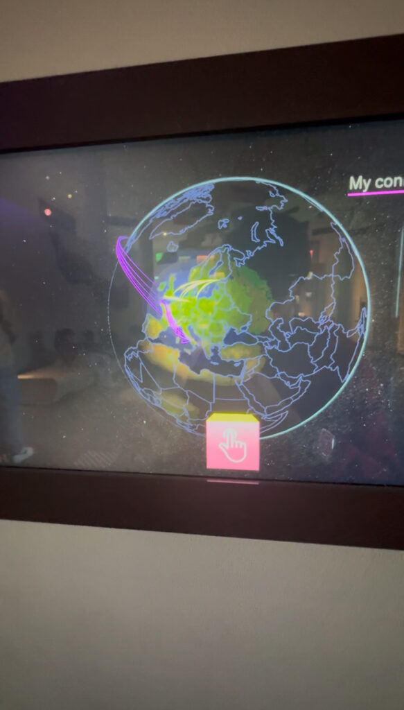 L’attività interattiva che mi è piaciuta di meno è stata quella sulle connessioni con le città. Dovevamo scegliere sei città significative per noi, e il dispositivo avrebbe dovuto mostrarci le connessioni tra queste e altre città nel mondo. Tuttavia, la grafica non era chiara e, dopo aver fatto le selezioni, non era facile capire cosa volesse comunicare.